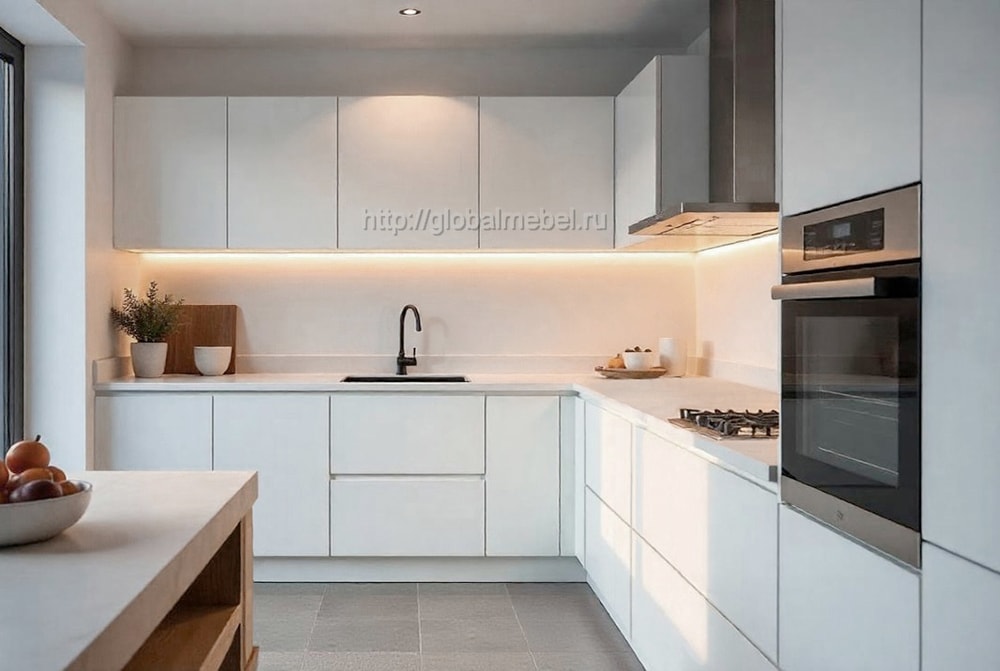Кухня Белый Gola с фасадами из ЛДСП Egger: длина кухни 4,2 м, стоимость 370180 р. Используется профиль Gola, который создает за дверцей нишу. Для открытия нужно захватывать сам фасад. 200 расцветок. Можно также изготовить с фасадами из пластика, акрила, МДФ под эмалью, МДФ под ПВХ. Стеновая панель: из пластика Egger в декоре Камень Пьетра Гриджиа.