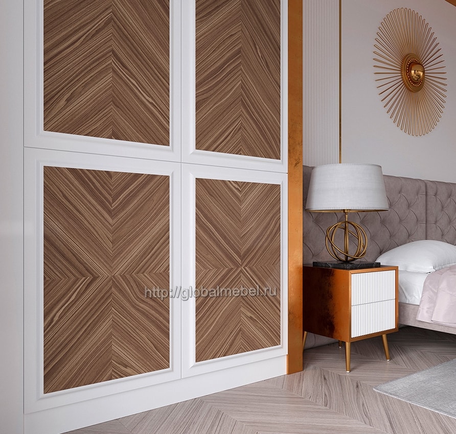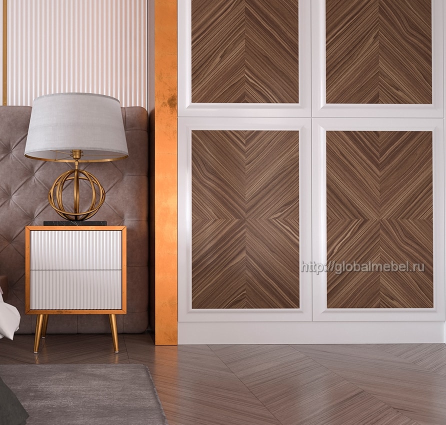 Шкаф с дверками из МДФ эмали и шпона Файн-лайн Фиоре Орех и тумбочка Волна эмаль. Сшивка Ромб X. Размеры: шкаф 1,2 м плюс тумбочка 0,4 м, стоимость 208700 р плюс 21200 р, можно выбрать другие габариты. 1000 видов шпона.