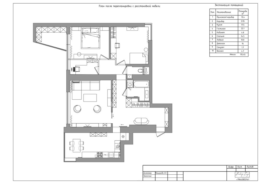Данную квартиру разрабатывали для семьи из трех человек общая площадь квартиры составляет 115 м2