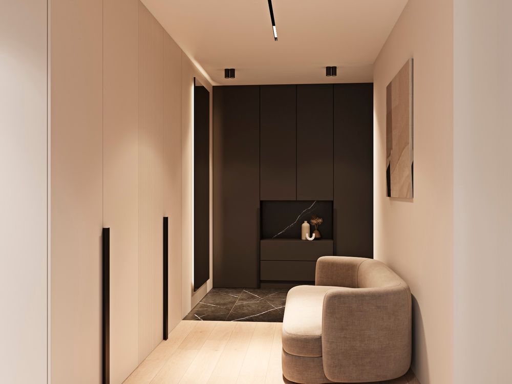 На лоджии заказчики не хотели кабинет , только вариант гардеробной и вот что я предложила чтобы решить ситуацию .