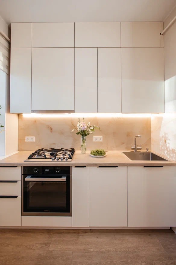 Такой гарнитур отлично подойдёт для малогабаритных помещений, где каждый сантиметр пространства на вес золота. Как вам эта уютная кухонька в цвете «тирамису»?