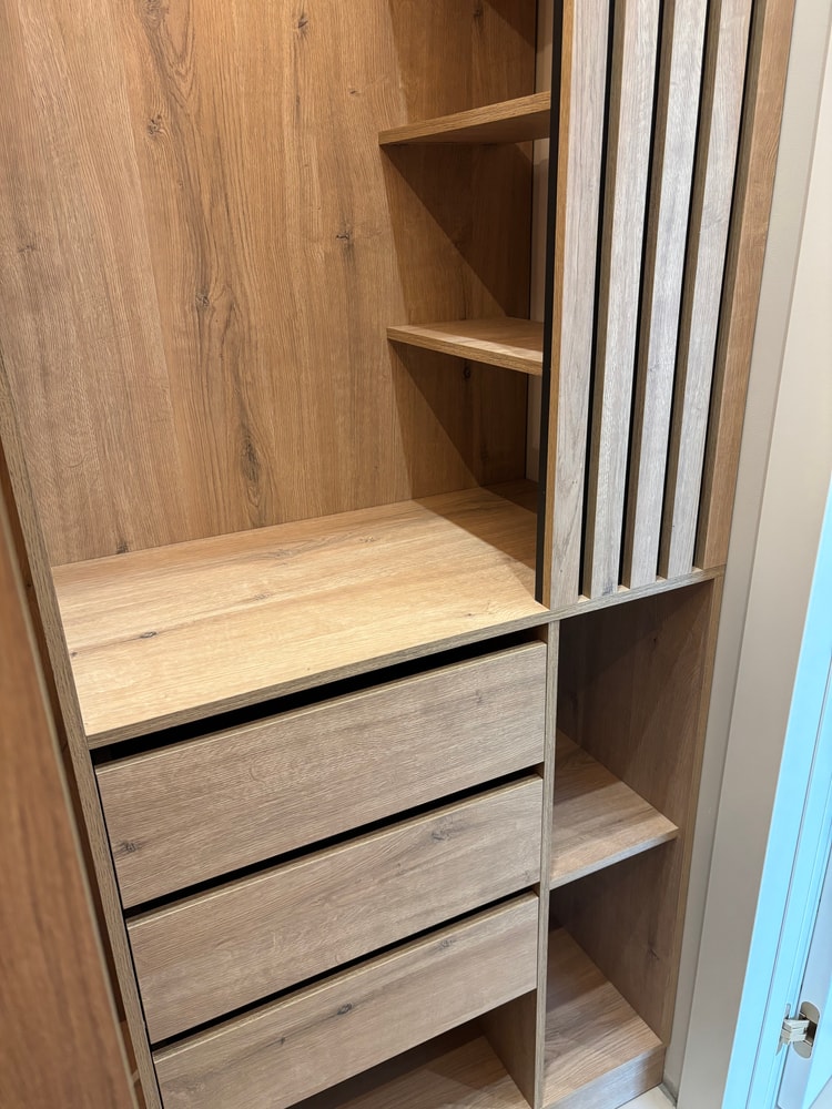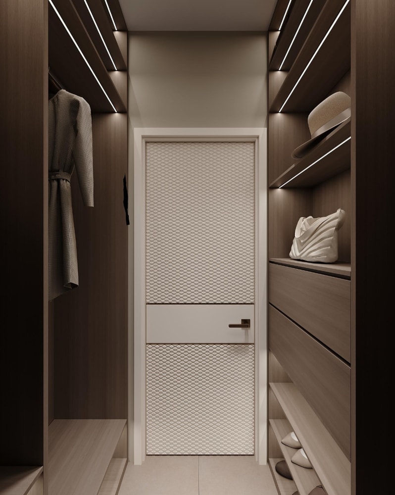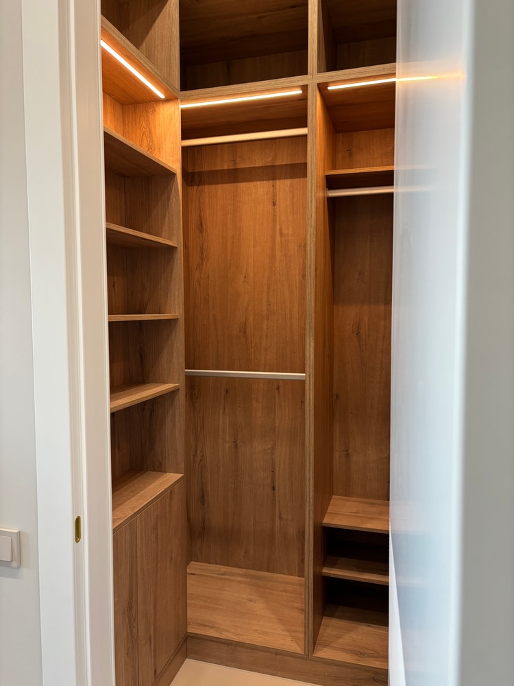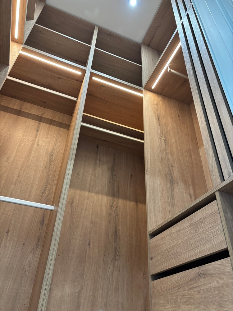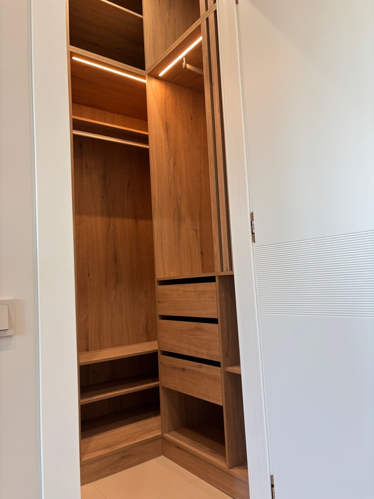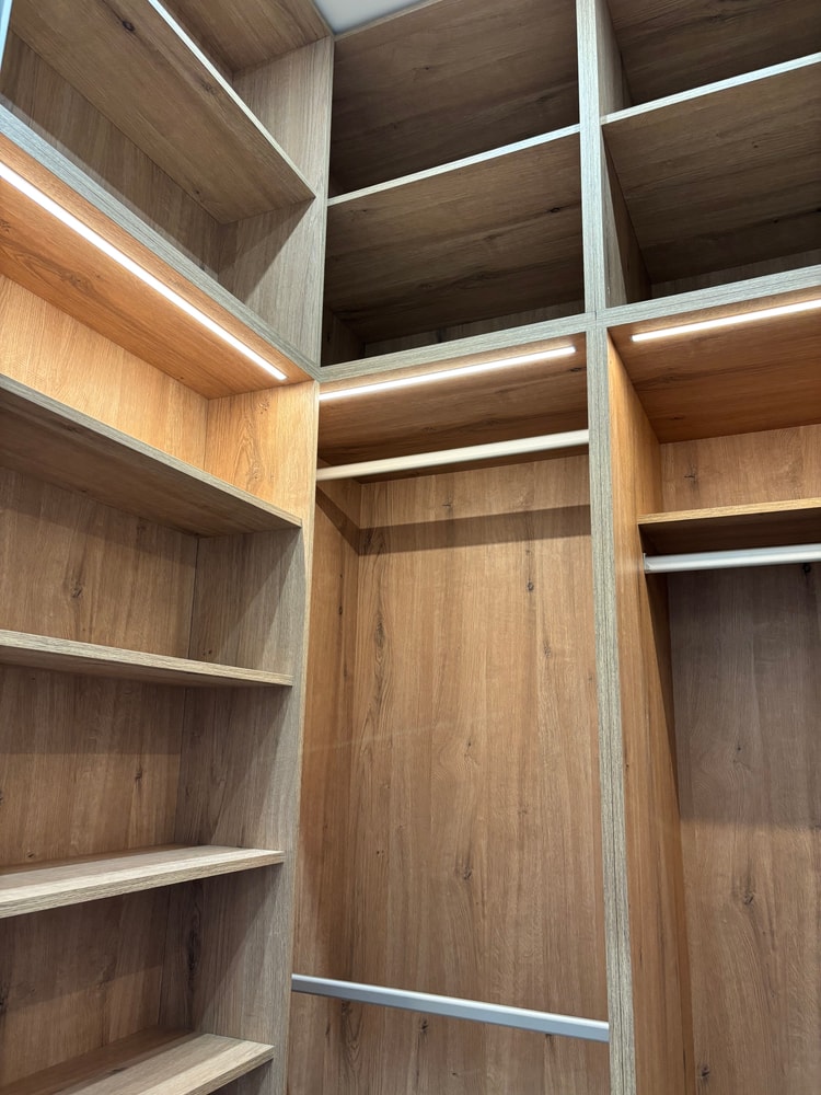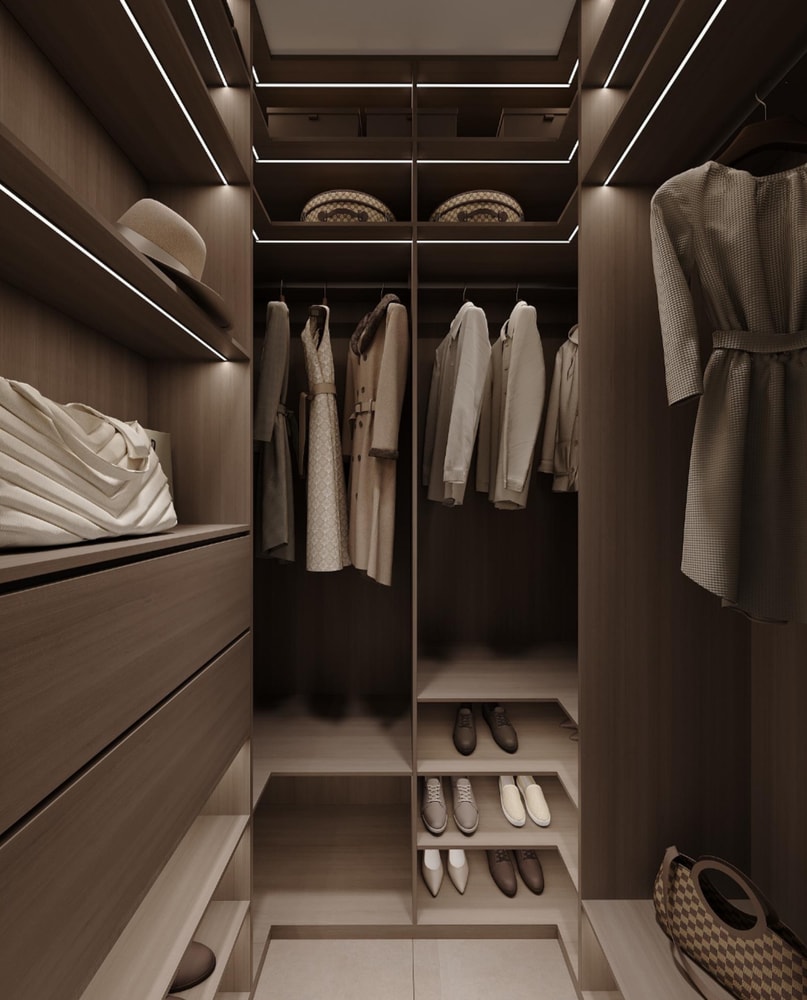 По согласованию с заказчиками оставили только одну линию подсветки шкафов гардеробной. Они посчитали, что в дизайн-проекте это было излишне.