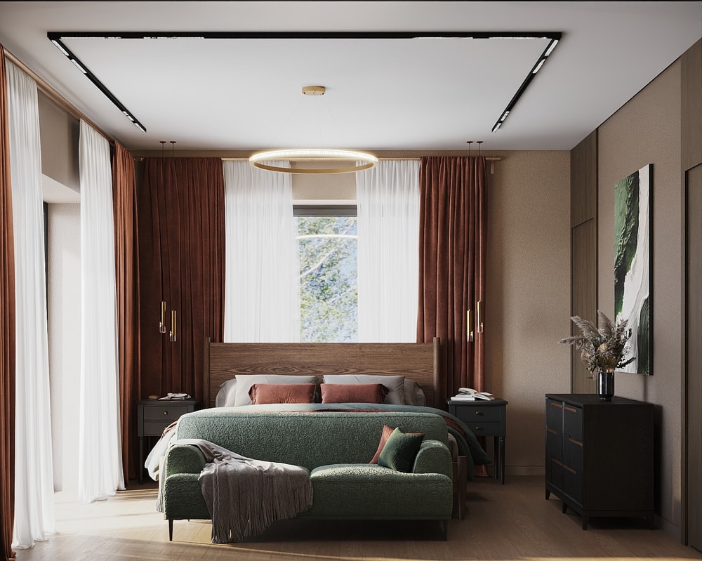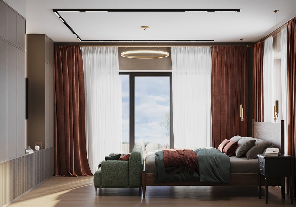 Шторы в изголовье кровати как будут закрываться/открываться? Может лучше на этой стене сделать римские, чтобы сбоку можно было подойти? Ну или с пультом тогда.