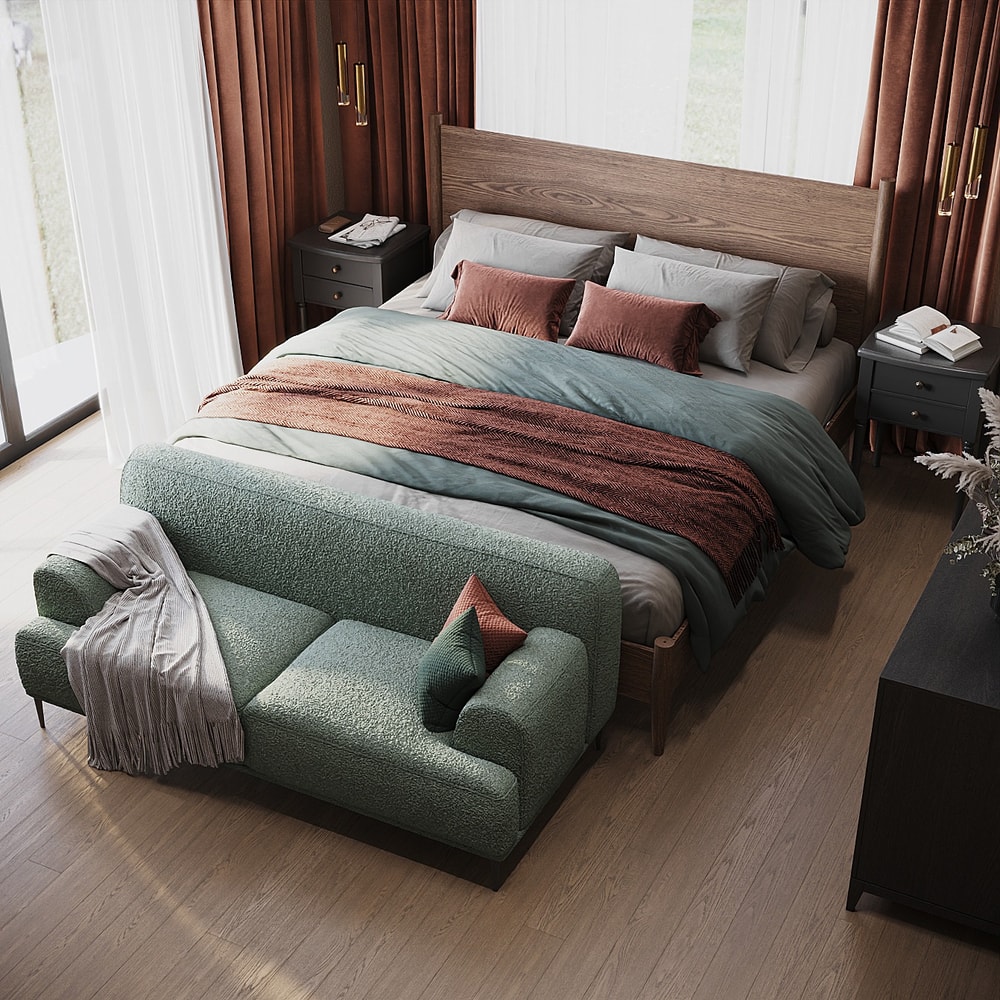 По стилю - плитка зеленая красивая. А вот вертикальные полосы на фасадах уже очень приелись и навевают мысли и о каком-то типичном офисе или типа того. Я бы сделала фасады попроще. И у вас три бежево-коричневых деревянных цвета. Кровать и пол под дерево стоит сделать одинаковыми. Может нечто среднее по тону - потемнее пола, посветлее кровати? А бежевый на шкафах - просто на мой субъективный взгляд грустный грязный некрасивый цвет. Попробуйте варианты, где шкафы и стены будут нейтрального серого/голубого, как покрывало или даже зеленого или бардового, какие уже есть в интерьере.