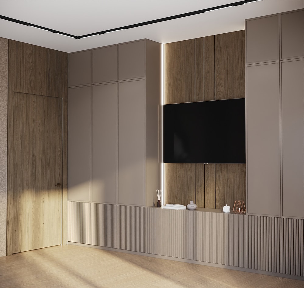 В спальне трек бы встроенный делала и, конечно, ниши для штор. И лёгкое ощущение, что диван в ногах не родной. Грубоват, кажется великоватым. Но может это ощущение из- за грубой текстуры, её мельче нужно как мин сделать или поменять может на рогожку. Переливных тканей и так много. Телек высоко висит. По; хорошему 1200 мм от ЧП до центра ТВ, можно 1300.