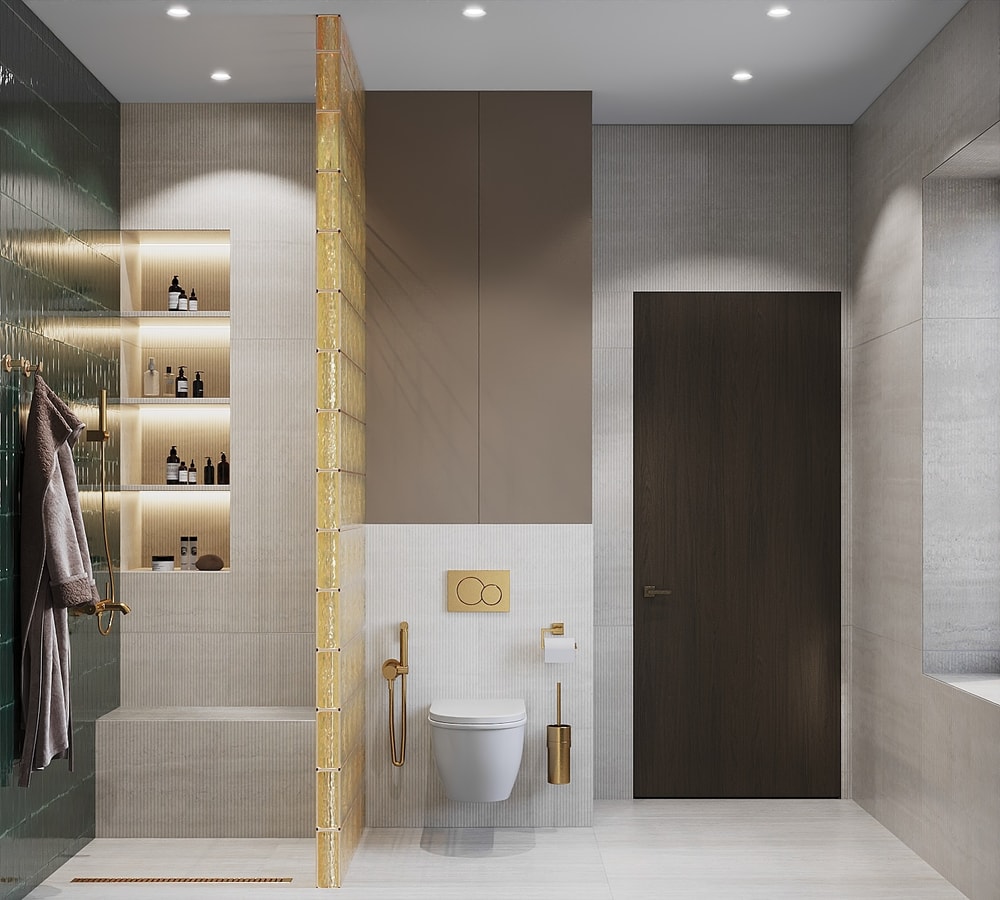 Так же убирала бы объёмную плитку из мокрой зону, если вода там на яйс, то чистить эту мелкую волну- просто сдохнуть. Вообще бы не делила по цвету стену в душевой и за унитазом. Наоборот оставила бы одним большим пятном. Или гладким беж или гладким белым. Причем за унитазом общив мебельный щитом, как и фасады над инсталляций.