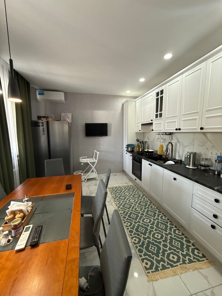 А из каких соображений вы хотите туда ковер положить? Для чего? Это самая грязная зона кухни, ковер там совсем ни к чему. Да и смотрится он инородно