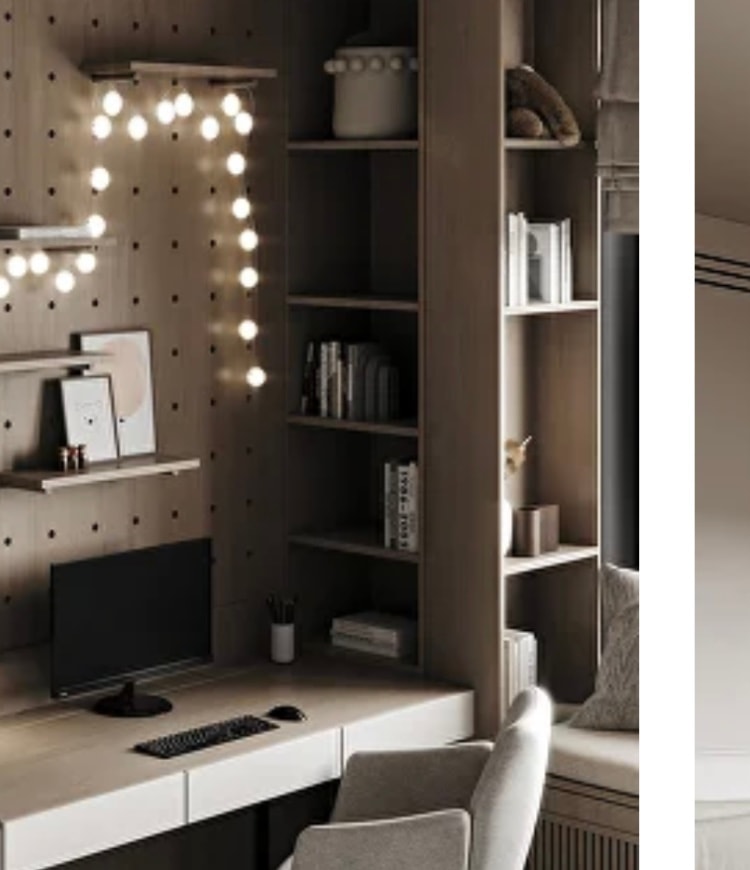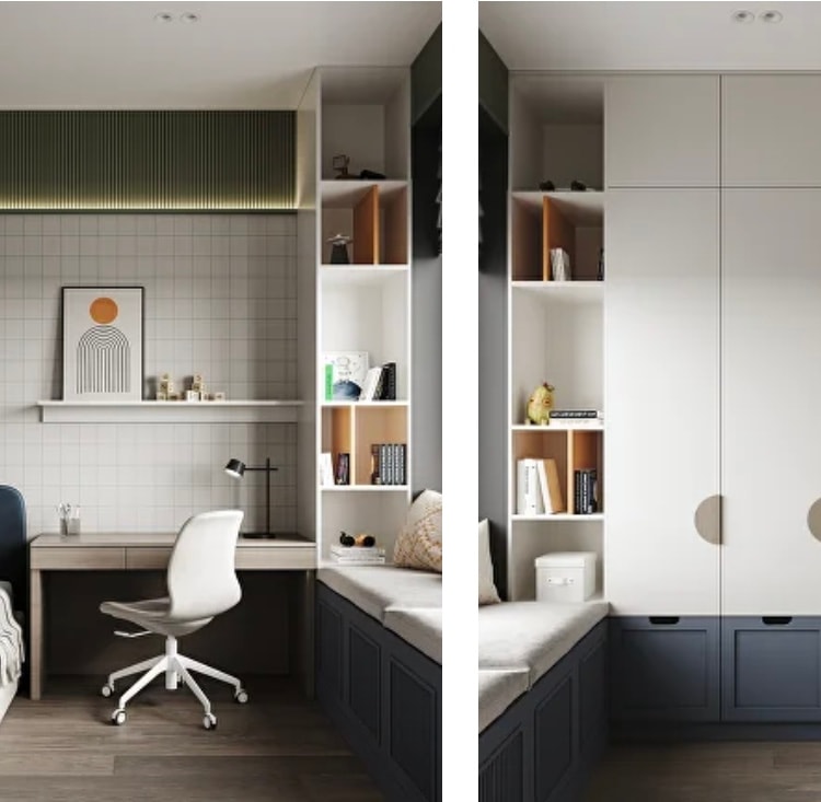 Я за вариант 2. Все таки визуально есть зонирование на спальную и рабочую зоны: спальня темнее, рабочая светлее. Стеллажи и чил зона у окна - отличное решение. Открытые полки - нормальная тема.