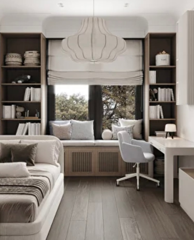 У окна - мягкий подоконник и стеллажи, типа такого
