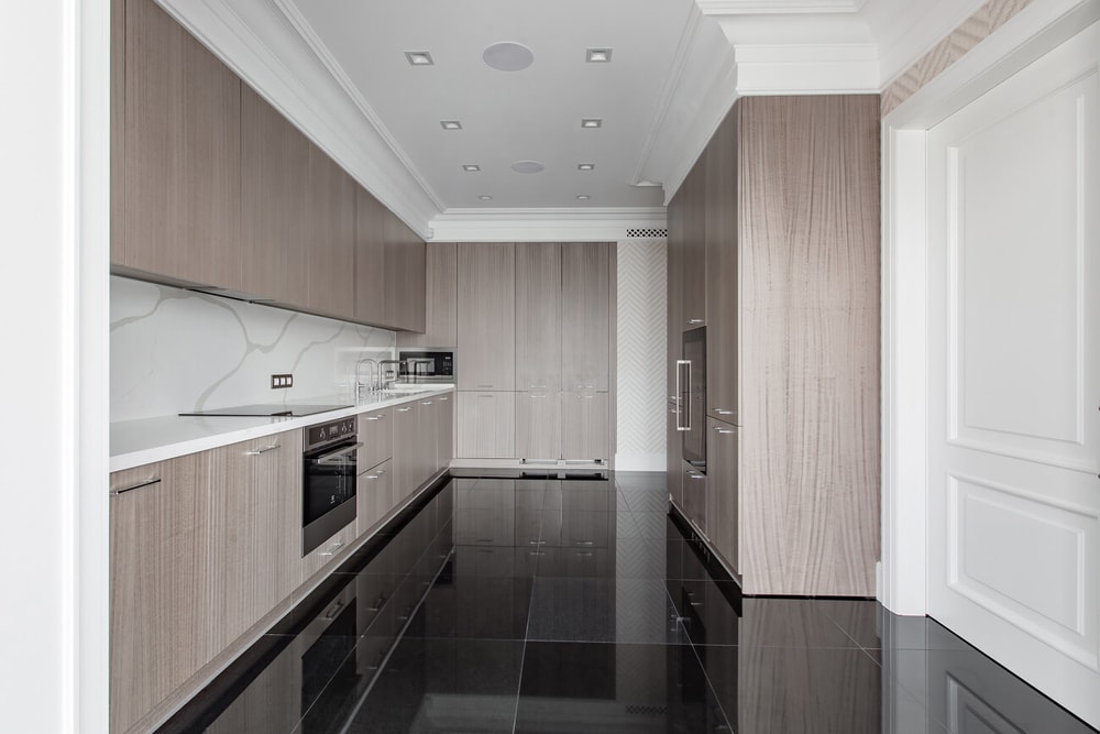 Наши заказчики на крайней кухне вообще опустили короб, чтобы не делать высокую кухню. На фото кухня еще немного не доделана, но видно потолок и карниз.