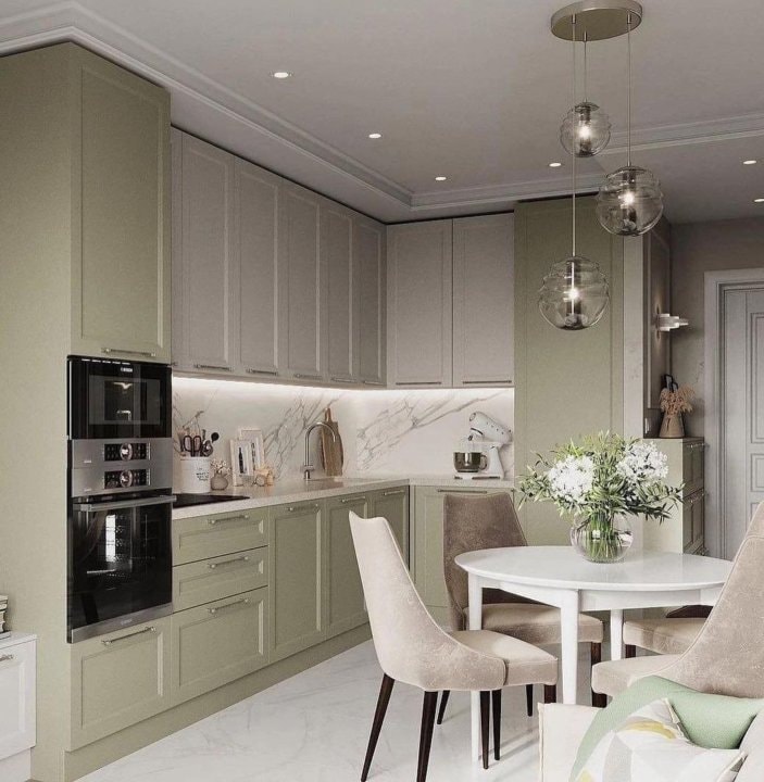 Интерьерное решение кухниЕсли есть потолочный плинтус и кухня не до потолка, то смотрится это примерно так.