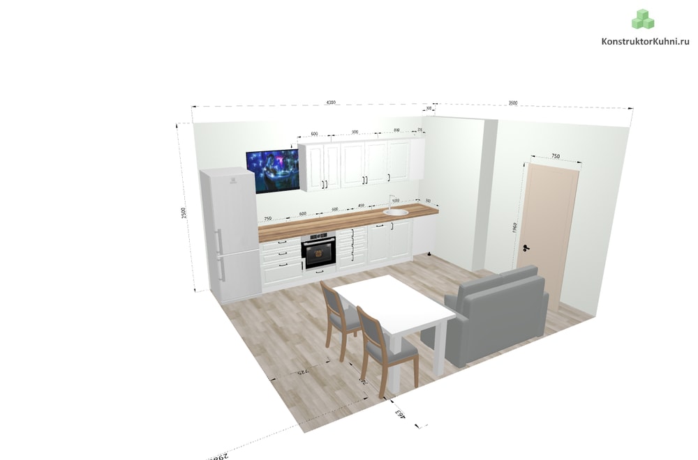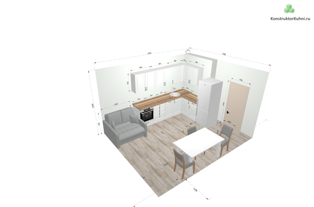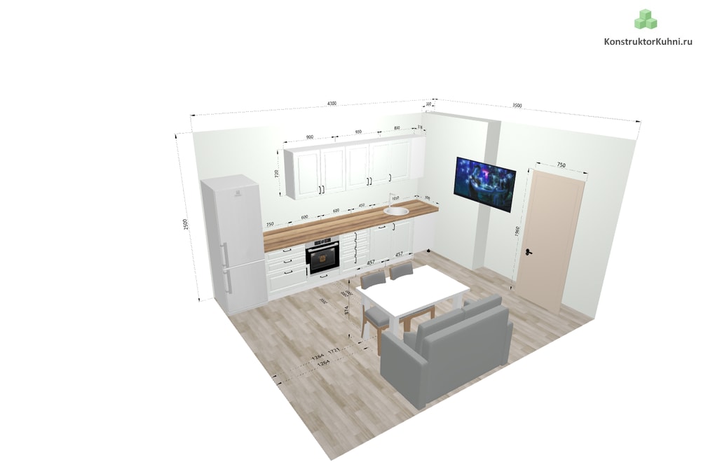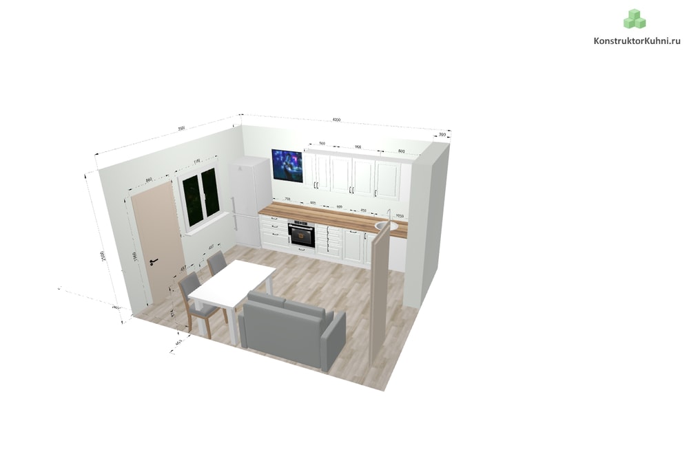 Кстати тут нет варианта где кухня начинается от двери, такая расстановка позволила бы угол освободить, но сразу скажу 120 см дивана (учитывайте, что это ширина спального места, а еще и подлокотники нужно учесть) не удобна для двоих.