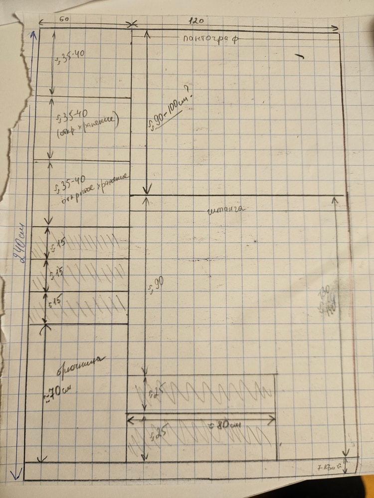 Это только мой шкаф, у мужа отдельно. Как думаете насчёт верхнюю штангу сколько см правильно будет заложить 80-90-100см по вашему опыту? Заштрихованные это выдвижные для нижнего белья, ремни, аксессуары. И слева наверху 3 открытые полки для хранения вещей, которые не так часто используются