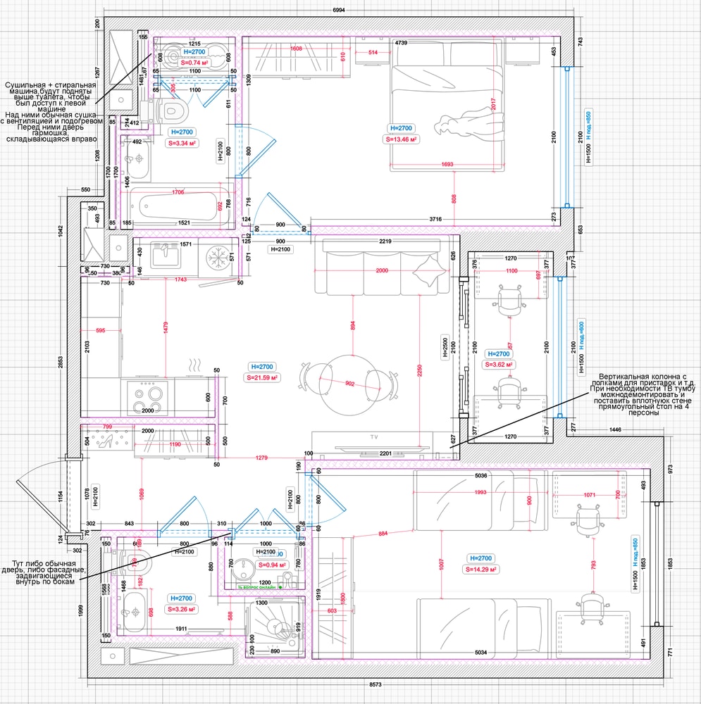 Планируем ремонт в двухкомнатной квартире. Стен сейчас нет, на свои местах остаются только вокруг санузлов, остальные можно переносить как угодно. Все стены планируются из ГКЛ, перегородки в спальнях и внешние стены будут с шумоизоляцией.