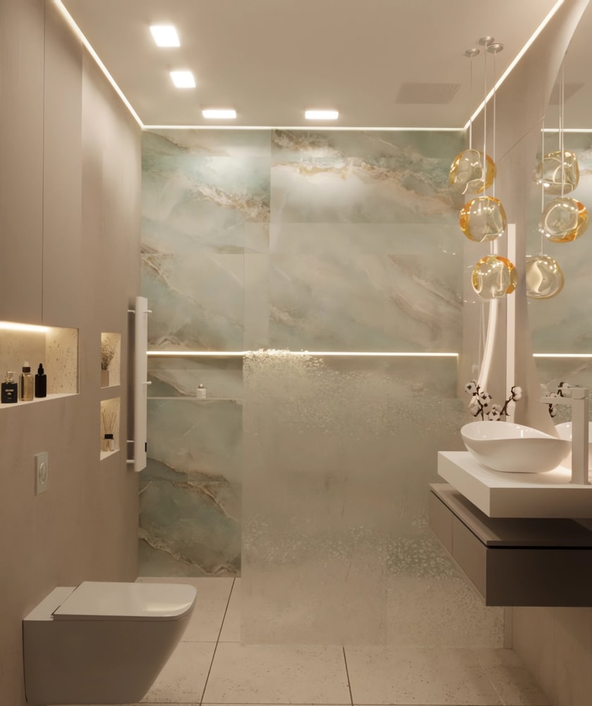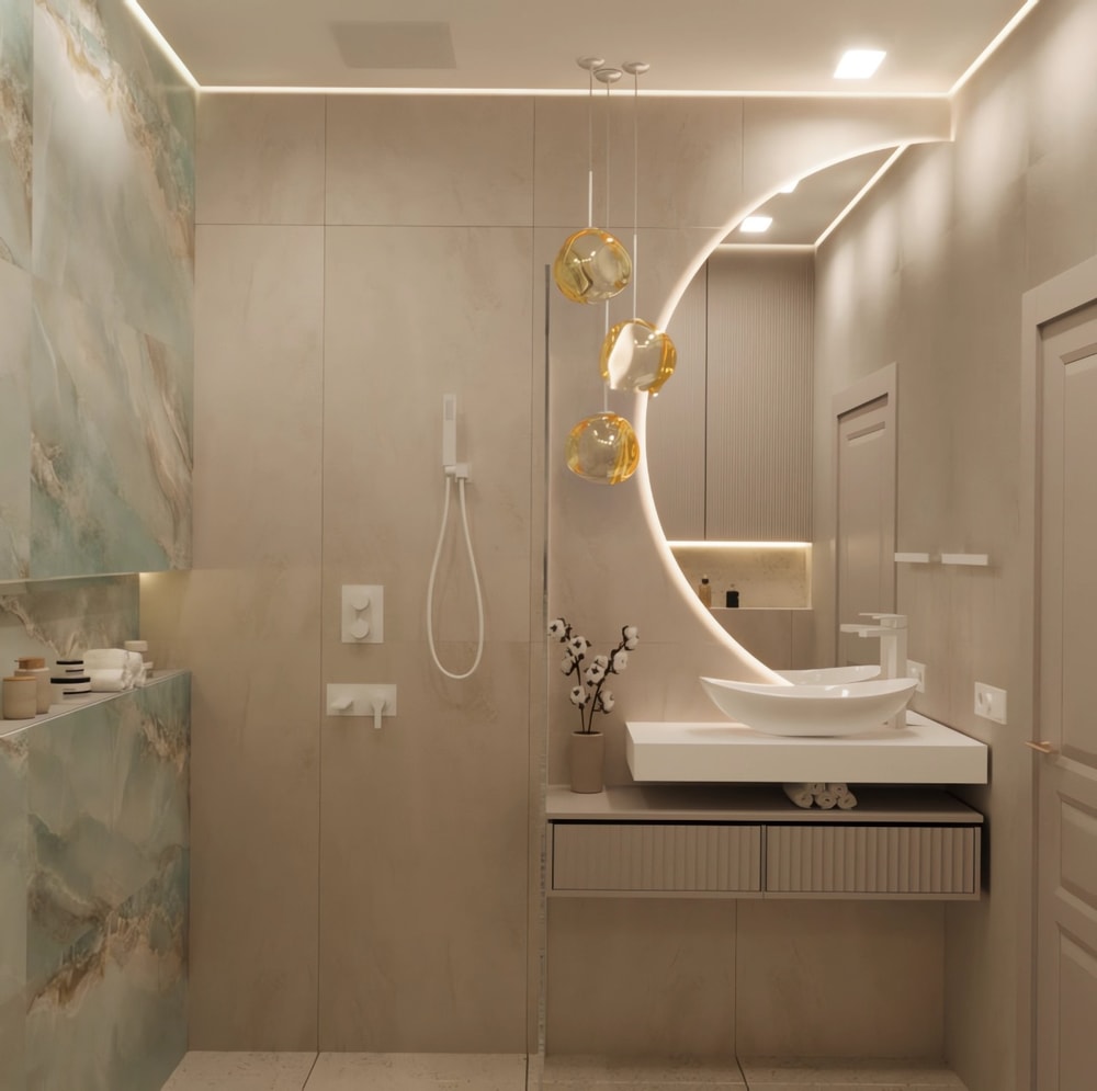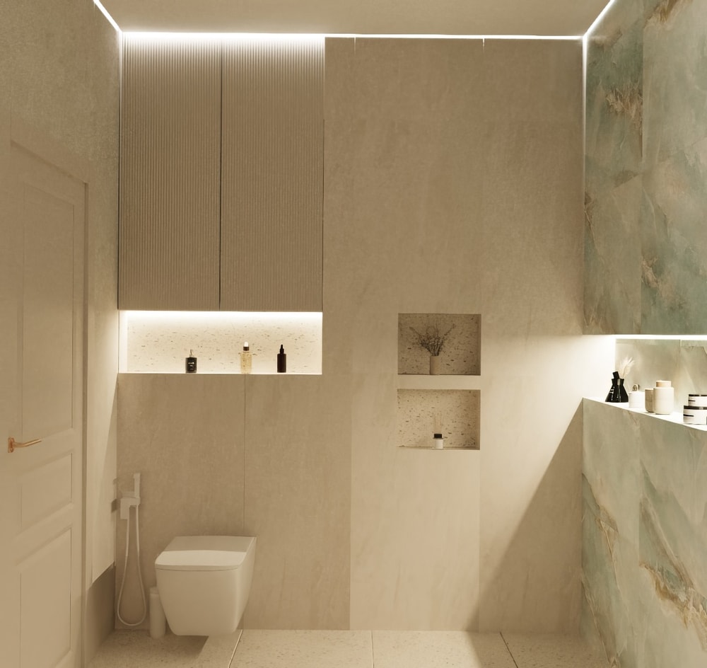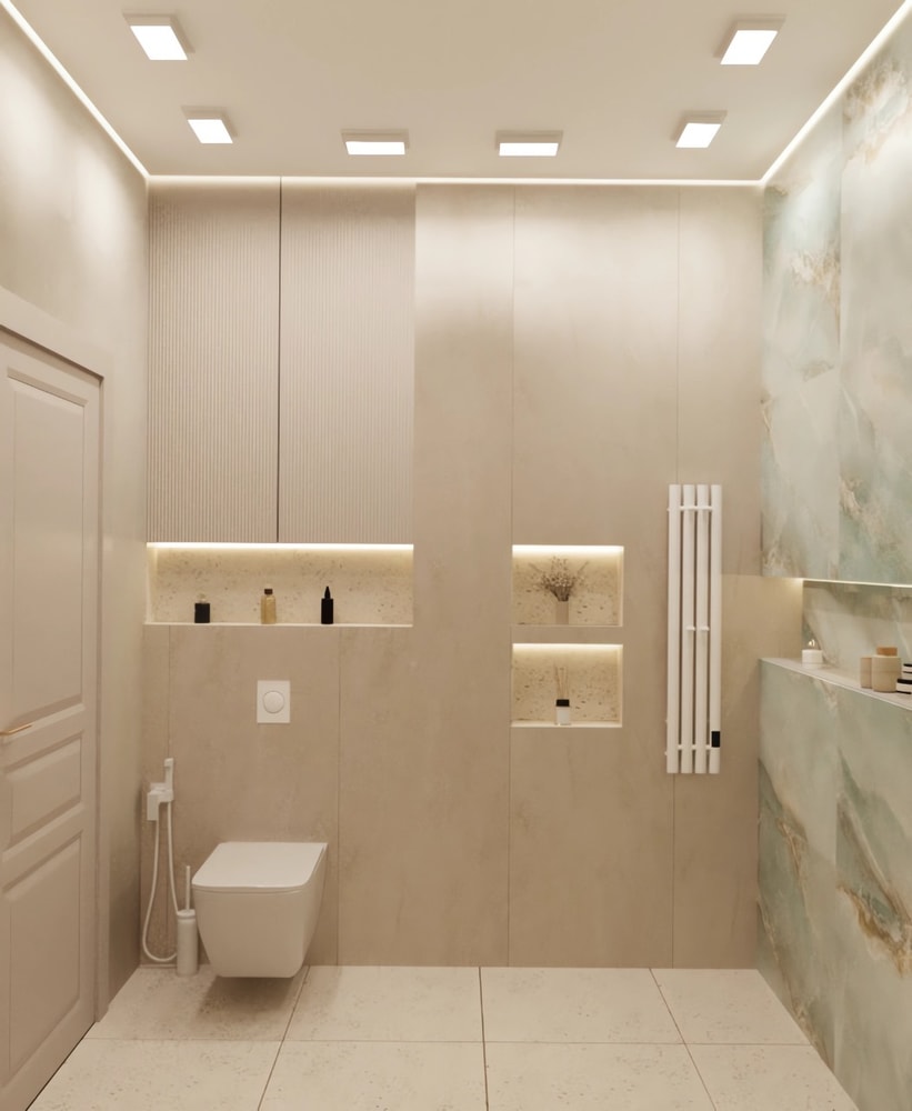 Интерьерное решение ванной комнатыДобрый всем день!Не знаю где была моя голова ( наверное, беременный мозг думает иначе), но я все это дело одобрила и уже точка невозврата пройдена ( стены в плитке, выводы сделаны, краны белые и унитаз куплены). А у меня настрой- хоть все отбивай. В реальности- все выглядит еще плачевней, с дежурным холодным освещением- стены цветом как в подвале серо- бетонные, а акцентная стена- холодного сине грязного оттенка( сделаю фото сегодня).Подвинуться теперь можно только в тумбе, зеркале, декоре, раковине, светильниках, дверцах шкафа над туалетом…