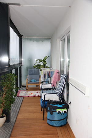 А у нас типичный немецкий балкон: на полу специальное ковровое покрытие для балкона, столик и стулья, и обязательный предмет - гриль! Мы едим на балконе, играем на балконе, чатимся тоже на балконе)))