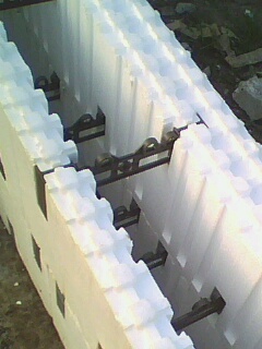 Да, это форма, которая не снимается потом. Сверху штукатурку накладываем и ровная стена получается. Изнутри очень удобно подводить трубы и проводку (в пенопласте вырезаешь под них канавки). Стена из бетона всего 15 см, зато монолитная. Арматуры конечно немало уходит.