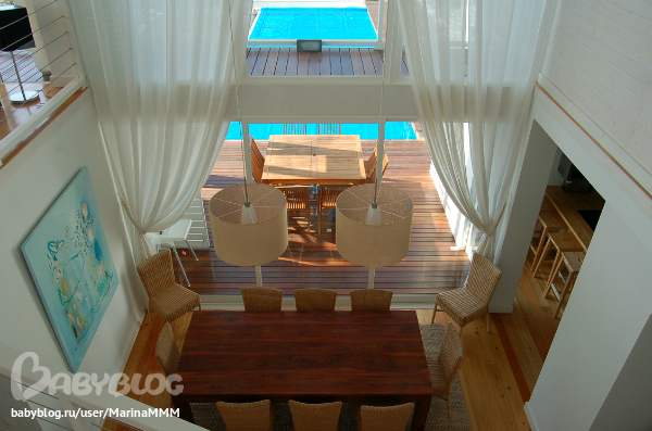 Второй этаж. Просторный мезонин-гостиная с доступом к веранде. Спальная комната с гардеробной, душевой комнатой и туалетом, а также ванная - джакузи с видом на океан и сад.