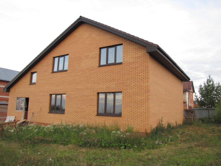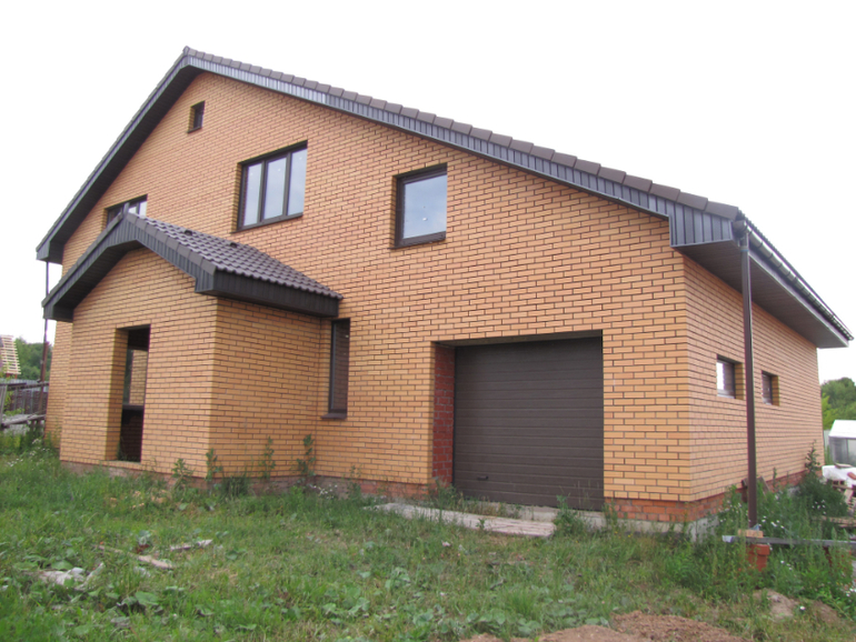 Стены полностью из кирпича + утеплитель (толщина 61 см). С утеплителем в пересчете толщина стен составляет 1м20см, зимой в доме будет тепло, летом - прохладно. Фундамент ленточный, перекрытия ж/б плиты, кровля - натуральная черепица. В доме встроенный гараж. смотровая яма, подвал.