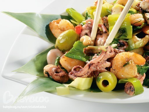Я оч. люблю морепродукты, не могу себе в них отказать. Т.к. майонез это зло, я себе делаю вот такой легкий салат))