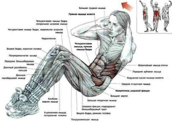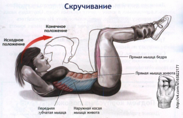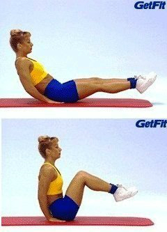 Цепляетесь ногами за батарею или за нижнюю часть диван, руки за голову и давай качаться. Высоко поднимать корпус не нужно. Сделайте столько раз, сколько сможете, а потом прибавляйте по 1 разу в день. Хорошо дойти до 30-50 раз, а затем постепенно увеличить до 100.