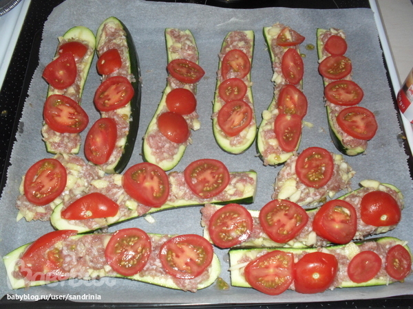 Фарш брала говядину со свининой, добавила туда мелко нарезанный лук и мякоть с цукини( Цукини разрезала пополам и вынула чайной ложкой серединку) Посолила, поперчила и нафаршировала цукини фаршем. Сверху помидорки. В духовку на 200 градусов, мин 20, потом посыпала тертым сыром и еще мин на 5. ( Если обед до 14.00 то можно чайную ложечку сметанки) Приятного аппетита!
