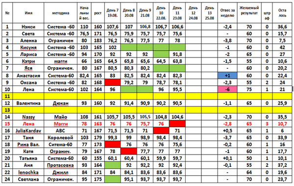 Привет! №12 - 90,4. Минус 100 гр., ожидала конечно большего, но вчера не крутила велотренажер, заболела, может по этому так мало. Погрешностей в диете, кроме сиропа от кашля нет.