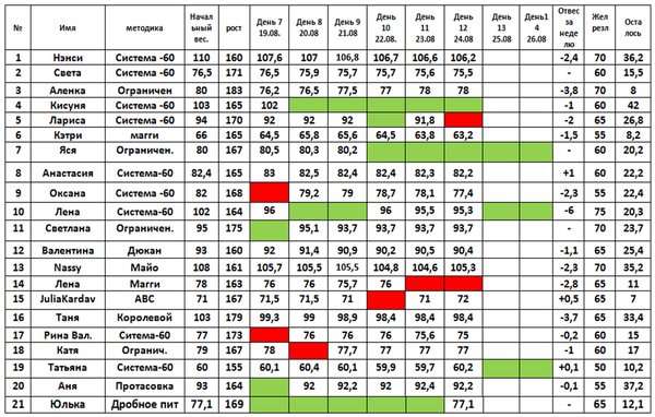 Отчеты-результаты о питании, о тренировкахДевочки, обратите внимание на последовательность имен в таблице, у многих изменились номера. Это все потому что я удалила двух участниц и одна участница покинула нас сама.