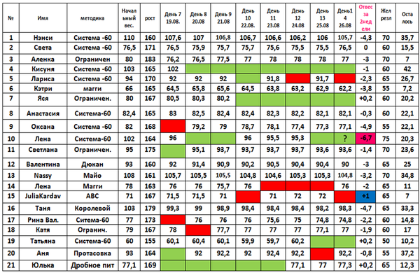 Результаты таблицы за 2 недели отмечены. Не знаю ли возможно ли такое на системе - 60 похудеть за 2 недели на 6 кг, я похудела на 4 но я реально себя держала в строгости, я ела только овощи, у меня теперь туалет это второй дом ))) от них меня очень часто "пардон - поносило" )))) у меня были очень частые физ нагрузки, иногда от болей в мышцах приходилось пить обезболивающее. По ночам сводило икры (((( Но я ни капли не жалею, я молодец и очень этим горжусь. Горжусь и вами, вы тоже у меня молодцы.