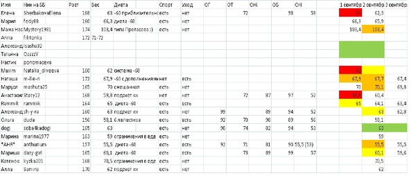 Отчеты-результаты о питании, о тренировкахДевочки, выкладываю табличку. Проверяйте, а то я пока еще путаюсь)))