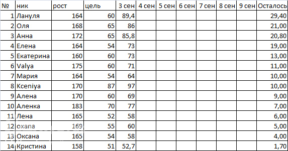 Отчеты-результаты о питании, о тренировкахНаписав вчера сообщение о намеренье худеть, поужиналп пиццей и закусив все это хорошим кусочком тортика пошла составлять таблицу. Нас пока не очень много, но уже 14 человек, настроенны все по боевому))