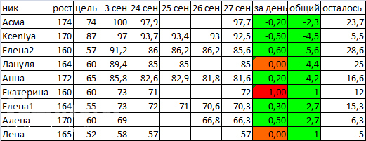 Привет! отчитыываюсь за 29.09 - 84,4! Наконец-то! Правда ненадолго, едем к папе на юбилей, так что все вернется, еще и с собой прихватит(((