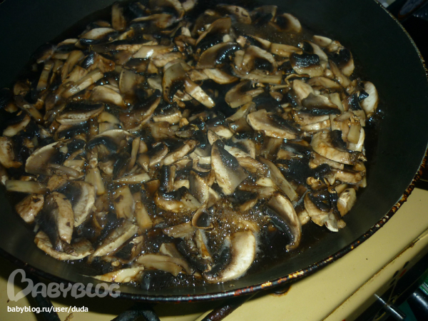 1) Нарезаем шампиньоны, тушим их в водичке до мягкости