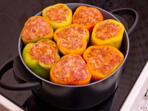 У перцев отрезать верхушку, удалить семена. Перец наполнить фаршем.