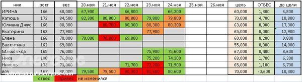 Отчеты-результаты о питании, о тренировкахДевочки, внимание в этом посте отчитываемся по весу за 25 и за 26 ноября. (завтра табличку не буду делать)