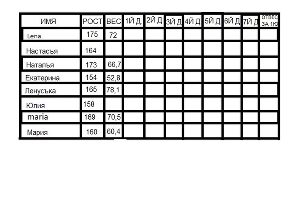 , сегодня уже2й . Делитесъ как прошел у вас 1й денек , какие резулътаты ? Кто , что кушал ? Какое самочувствие и настрой ? Сегодня выкладываю меню на сегодня и на завтра ну и конечно табличку . Проверъте пожалуйста у кого не хватает данных , скинъте мне . Всем хорошего дня и терпения , ну и конечно - девонъки не косячим - целъ не так уж и далеко .