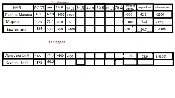 Приветик . Как ваши резулътаты , девочки ? У нас с Леной вчера были привесы , надеемся на ближайшие отвесики . Вчера наши ряды оставила Мария , осталасъ у нас одна Мария . Так что нас теперъ 3 участницы на 2й недели и 3 - на 1й неделе . Так что держимся и идем к цели .