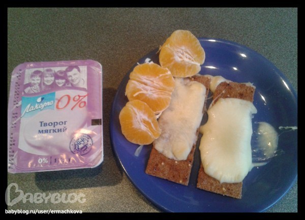 Полдник: творог, мандарин, и 2 хлебца с сыром