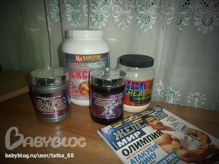 креатин (справа возле журнала) - порошок с лимонным вкусом, а огромная банка протеина - порошок с шоколадным вкусом)))) (хотя странно - в чеке было написано апельсин) но я не жалуюсь))) шоколад, так шоколад)))))))))