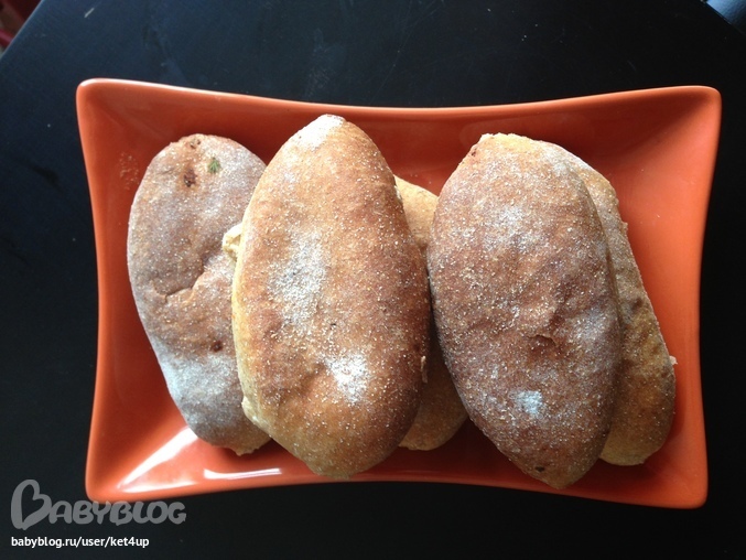 Брала 50 г теста и 50 г начинки. Запекать в духовке около 15-20 минут. Получились такие хорошие по размеру пирожки, чуть меньше ладони. Калорийность на один пирожок из перечисленных ингридиенов вышла 134 ккал на пирожок) Очень вкусно, сытно и для фигуры не страшно)