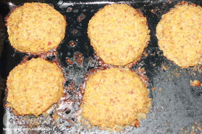 Гречнево-овощные котлетки (гречку заранее замачивала в воде, всё что было дома-капуста, перец кр и жел, 1 кортофель, морковка, лук - всё через мясорубку , добавила яйцо, чуточку муки и сформировала котлетки, протвинь смазала чуточку оливковым маслом, добавила немножко воды и в духовку на 15-20 мин)