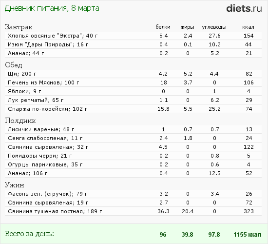 Из-за накрытого стола в полдник не ела творог, а всякие вкусности - салат свежий, грибочки, мяско ))) Ни разу за весь период моих отчетов углеводов не было так много за день! Ну, завтра все как обычно. Единственным соблазнением для меня была свиная колбаса - но я удержалась )))