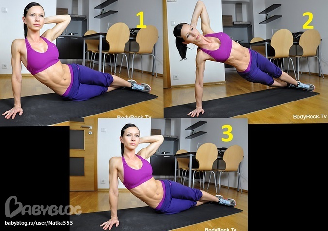 Позиция 1 - исходная. Затем поднимаете туловище, как на картинке 2 и опускаете его в положение, как на картинке 3. Это одно повторение. Можете не полностью ложиться на коврик в третьей позиции, просто слегка касайтесь пола или не доходите до пола 1-2 сантиметра. Главное чувствовать напряжение в косых мышцах живота. Ну, и не плюхкайтесь на пол со всей силы. Тело должно быть постоянно в напряжении. Сделайте это на обе руки и сложите результаты. Итог запишите в своем вечернем отчете. Мой результат: 35 на левую и 33 на правую руку, всего: 68 повторений. Даже боюсь говорить, ДЕРЗАЙТЕ! ![]()