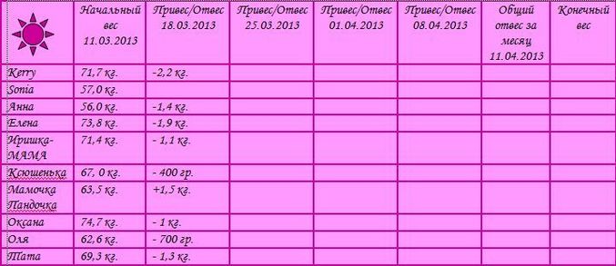 Я 1 кг 300 г потеряла, на весах - 68 кг. Маловато, конечно, но я пока физ. нагрузки не подключала, лень что-то, но чувствую - придется)