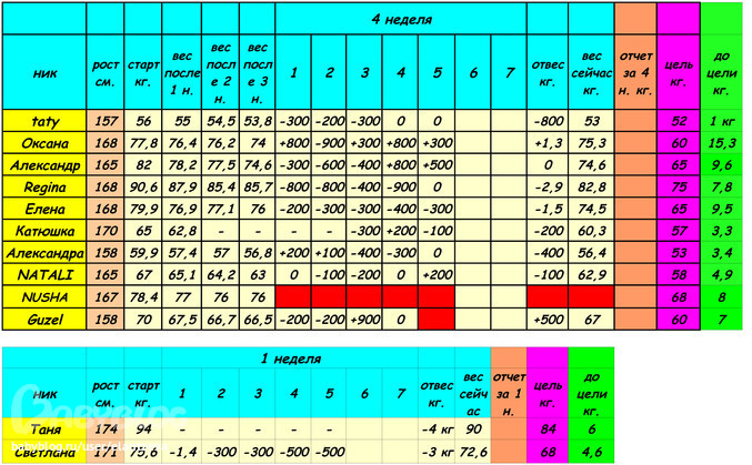 девчонки, привет. слежу за вами вы когда итоги то подводить будите. оень интересны результаты. хотелось бы рост вес до и вес после, а то как то не могу никак решиться на эту диету.