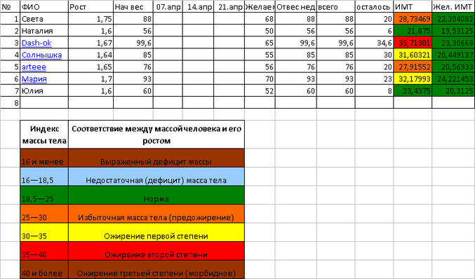 Отчеты-результаты о питании, о тренировкахДевочки проверяйте таблицу, все ли верно.