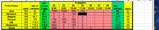 у меня -700. спорт все-таки сила) я уже 85 кг и завтра будет месяц как я борюсь с жирком, всего месяц назад я весила 94