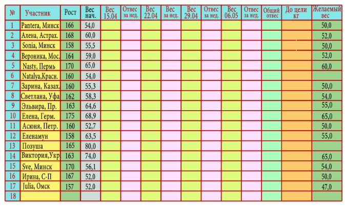 Каждый понедельник каждый из участников марафона будет оставлять запись: свой вес после пройденной недели и что делали чтобы добиться результатов. Все участницы пишут свой вес, под своим индивидуальным номером ( Смотрим табличку). Те девушки, которые не отчитались в течении 2-х недель, из таблички удаляются!!! Если у вас вдруг изменились планы, и вы передумали худеть, прошу сразу меня предупредить...Поберегите мое время!