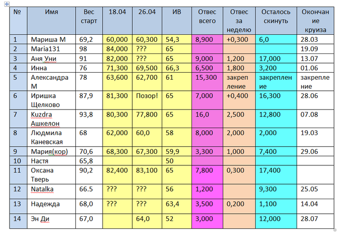 Отдельное обращение к новичкам-пожалуйста,прежде чем добавляться,хорошенько подумайте,а будете ли вы отчитываться каждую неделю? каждый раз вывешивая табличку к нам просятся новички,я заношу в табличку и после этого их как ветром сдуло(((( Если Вы все же решили к нам присоедениться,пожалуйста,скажите данные-Вес старт,Идеальный вес и окончание круиза,после того,как я Вас внесу в табличку,отчитываемся каждую пятницу в созданном посте.