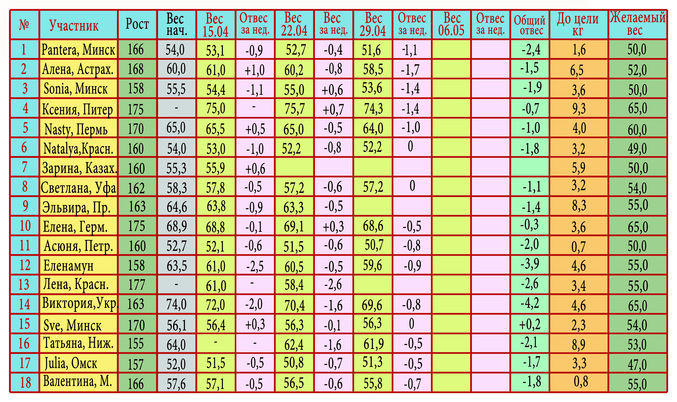 Отчеты-результаты о питании, о тренировкахИтак, табличка наших результатов за 3-ю неделю готова!